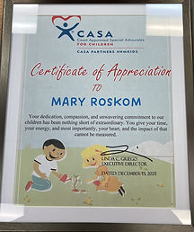 A tribute to Mary Roskom, one of the beginning founders of our CASA Partners 4NMKIDS program. We value her dedication and efforts to ensure that our abused and neglected foster children are safe and have hope for a better life.